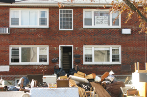 An apartment building's contents are placed on sidewalk in an effort to clean up after Sandy. The sign in the window reads, "We will get through this. God bless."